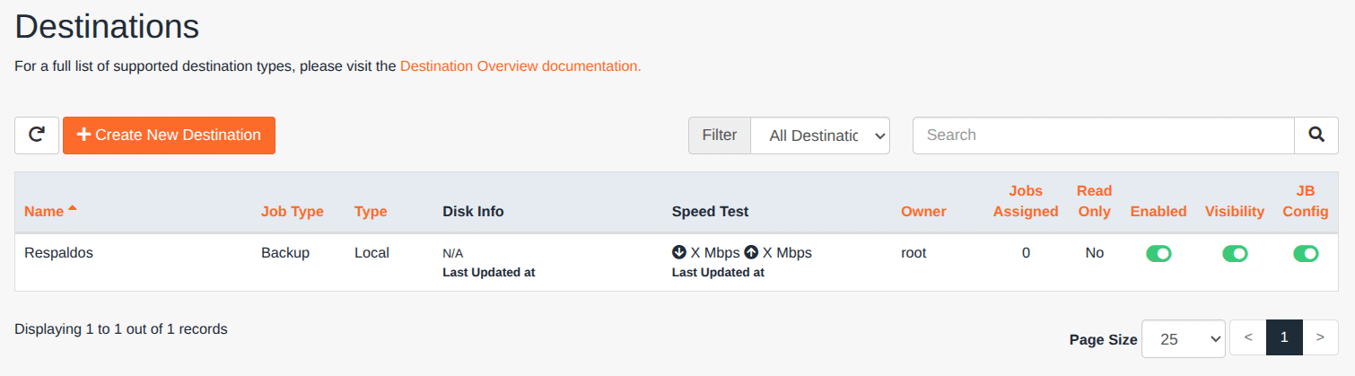 Para poder empezar la creación del repositorio, dirígete, desde la barra de la izquierda, al apartado «Destinations» (icono de carpeta) y cliqueá en Create New Destination