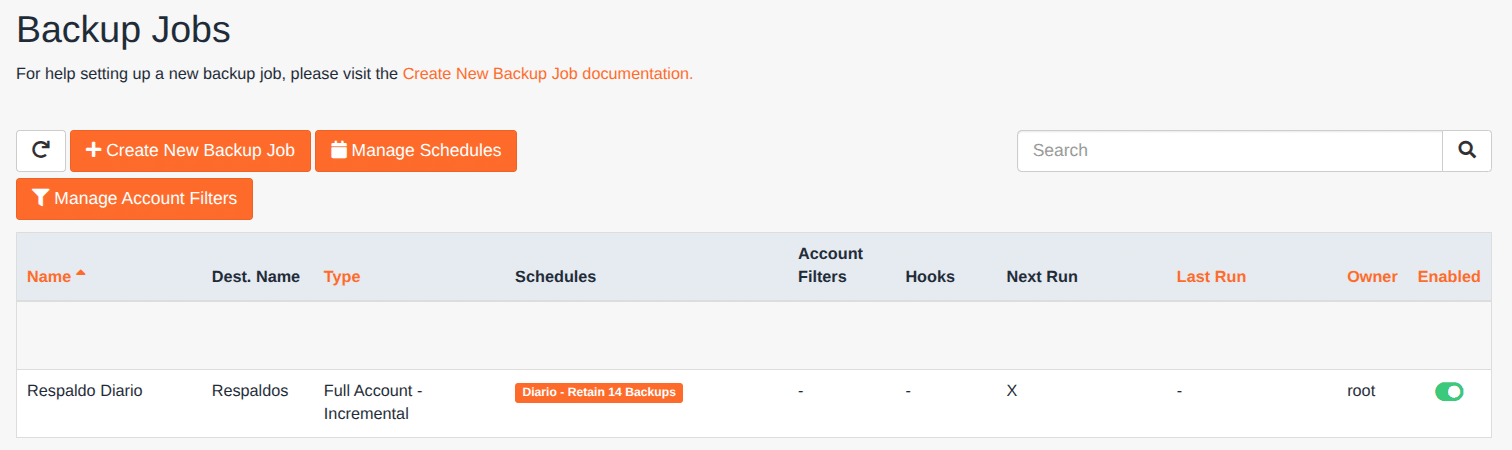 Una vez hayas adquirido una licencia de JetBackup, deberás de realizar una serie de pasos para poder preparar el entorno de forma que ejecute automáticamente respaldos de tus cuentas.