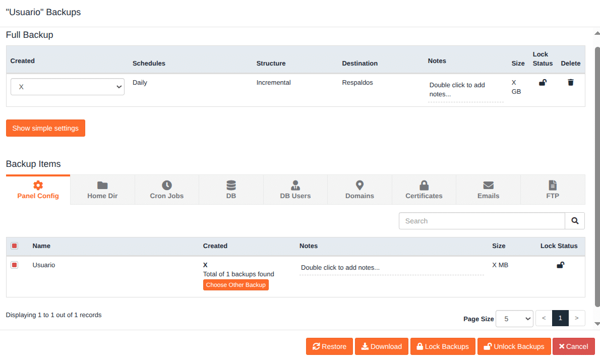 Si deseás tener más personalización con las acciones a llevar a cabo, cliqueá en Show advanced settings, con estas podés elegir granularmente la copia y los items que se utilizarán para levantar cada apartado de la cuenta (archivos, bases de datos, correos, etc.)