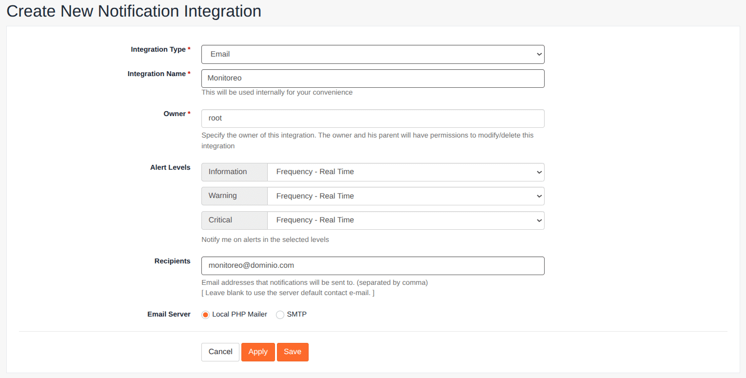 Una vez hayas rellenado el formulario, cliqueá en Save o Apply para confirmar los cambios y chequeá que tu integración de monitoreo haya quedado habilitada (slider en color verde, en el lateral derecho)