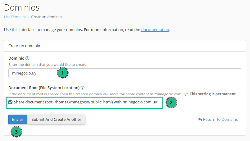 Esto hará que el nuevo dominio utilice la misma raíz del sitio principal, mostrando el mismo contenido.