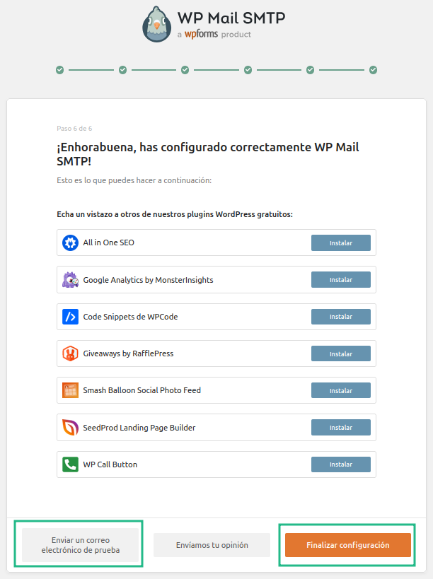 En esta pestaña, podrás presionar en Finalizar configuración o enviar un correo de prueba.