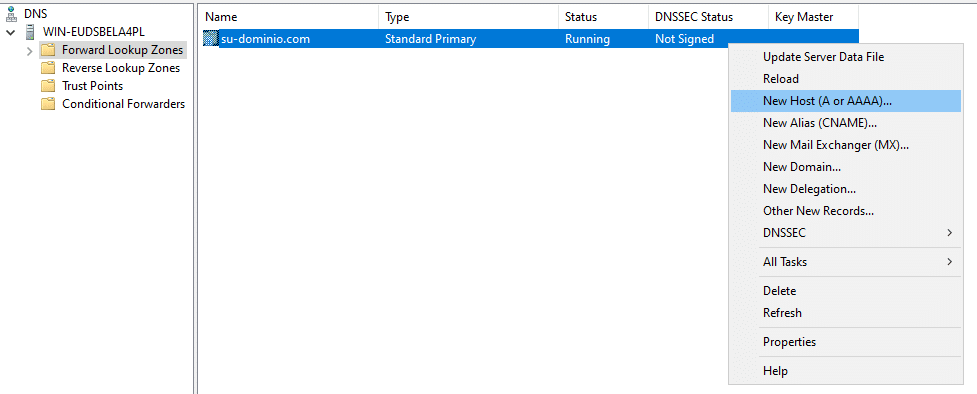 1. Hacé clic derecho en la zona DNS recién creada, y seleccioná el tipo de registro que deseas crear, para este ejemplo se creará un registro de tipo A (New Host (A o AAAA)).