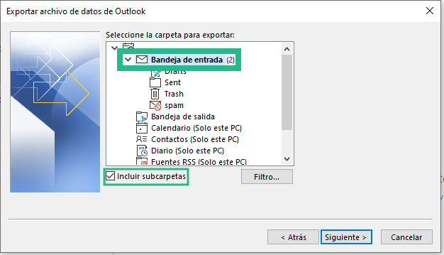 A continuación, podrás elegir las carpetas de correo que deseas respaldar. Te recomendamos incluir todos los buzones, por lo que debes seleccionar tu dirección de correo electrónico en la ventana “Exportar archivo de datos de Outlook” y verificar que la opción “Incluir subcarpetas” esté activada. Luego, hacé clic en «Siguiente» para avanzar.
