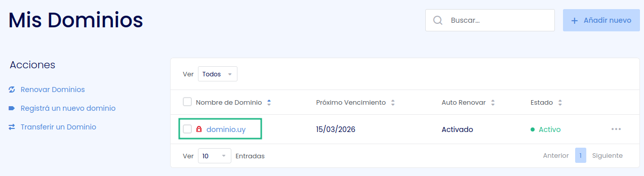 El sistema habrá listado todos los dominios registrados en tu cuenta, elegí al que le quieras deshabilitar la autorenovación y hacé clic en él.
