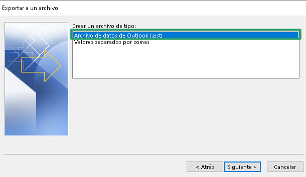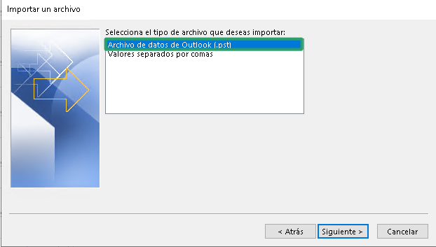 Seleccioná Archivo de datos de Outlook (.pst) y hacé clic en Siguiente.
