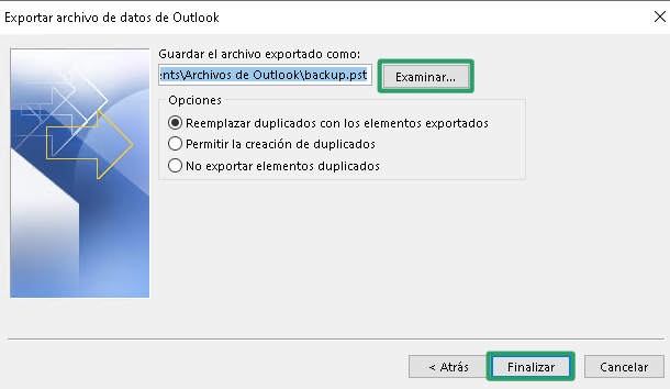 6) Por último, puede elegir en que ruta de su computadora se guardara el respaldo del calendario, así como el nombre del archivo .pst que contiene la información. Por defecto outlook elige una ruta y el nombre de archivo como backup.pst, si desea cambiar la ruta, haga clic en el boton Examinar. Para terminar, solo de clic en Finalizar.