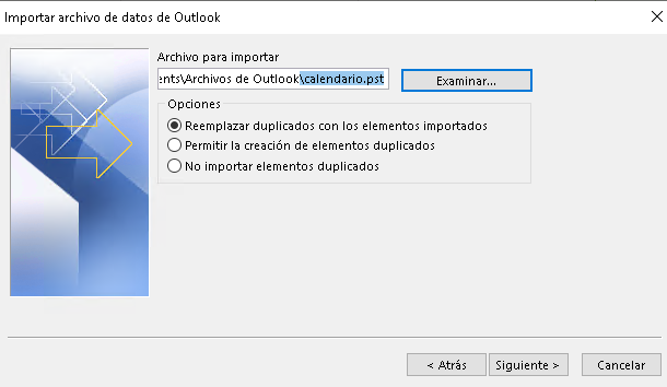 Ubicá el archivo que querés restaurar (por ejemplo, calendario.pst).