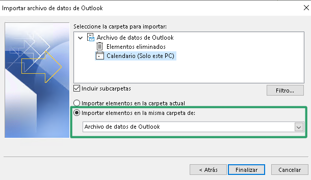 5) Seleccioná el calendario y este será levantado desde el archivo. Por defecto, Outlook levantará el calendario de forma local y no asociado a una casilla de correo, para asociarlo seleccioná la casilla desde el menú desplegable abajo de: «Importar elementos en la misma carpeta de». Por culminar hace clic en el botón Finalizar.