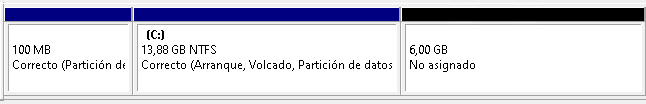 En este ejemplo, el disco C: muestra 6GB sin asignar a la derecha.