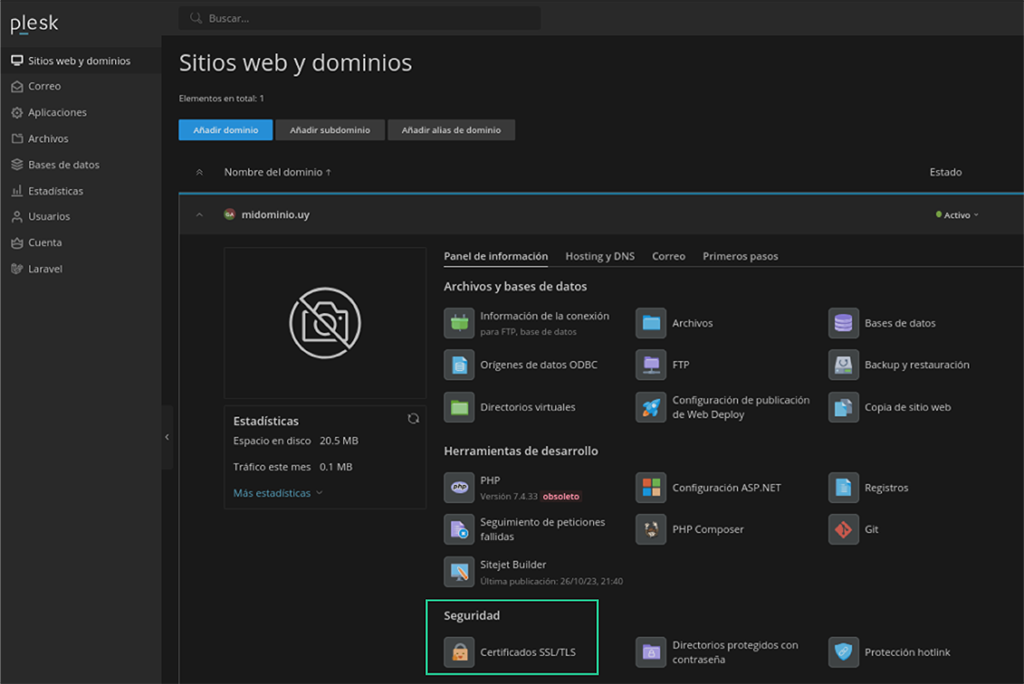 Desde el panel, ingresá a «Sitios web y dominios», luego dirigite a la sección «Seguridad» y seleccioná «Certificados SSL/TLS».