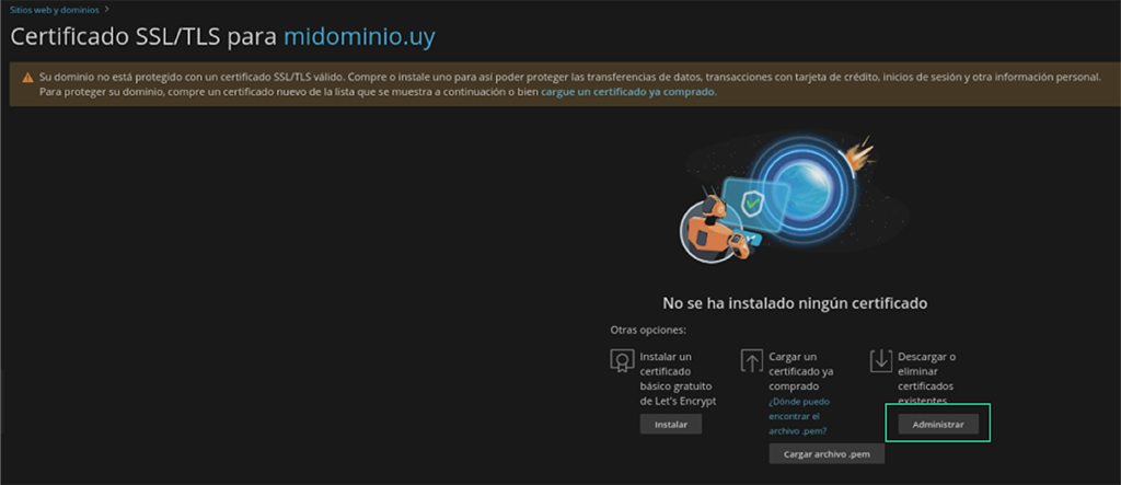 Hacé clic en «Administrar» para ver los certificados existentes.