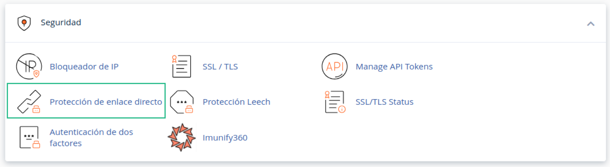 Dentro de tu panel de control de tu servicio, dirigite hasta el apartado «Seguridad» y hacé clic enñ «Protección de enlace directo».