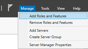 2) Desde la opción Manage en el apartado superior derecho, seleccioná Add Roles and Features.