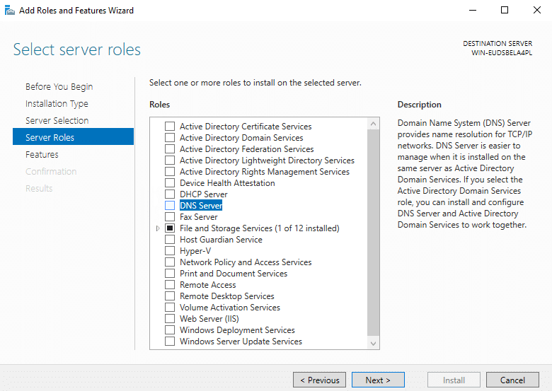 5) En el apartado Server roles (Seleccionar roles de servidor), activá la casilla DNS Server (Servidor DNS), luego seleccioná el botón Add Feature y por último Next.