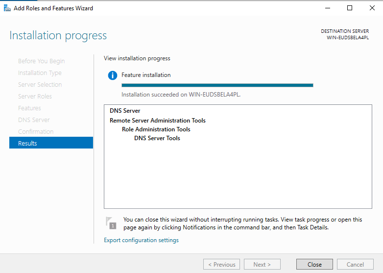 7) Una vez completada la instalación, podés cerrar el instalador con Close y la herramienta de Server Manager.