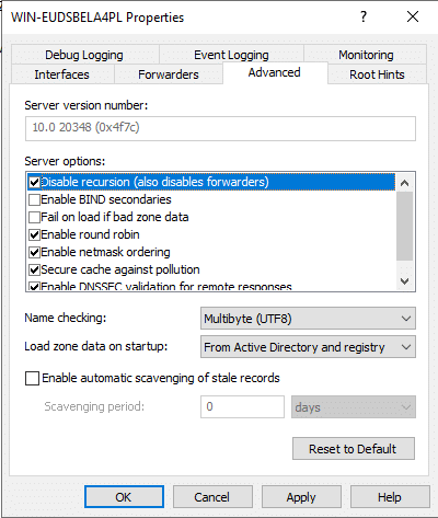 3) Desde la ventana emergente de propiedades, dirigíte a la sección Advanced y marcá la casilla Disable recursion (also disables forwarders).
