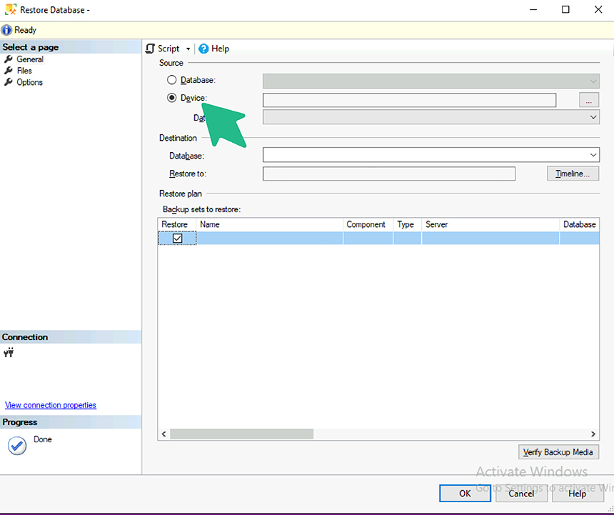 En el asistente de restauración, seleccioná «Device» como origen del respaldo.