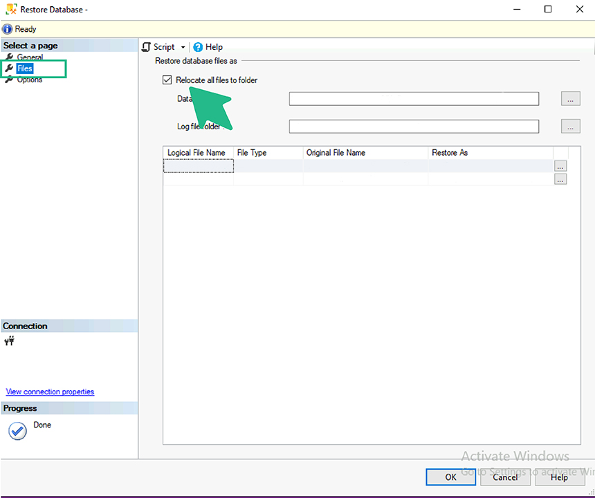 Ingresá a la sección «Files». Marcá la opción «Relocate all files to folder» para que SQL Server reubique los archivos de la base de datos correctamente.