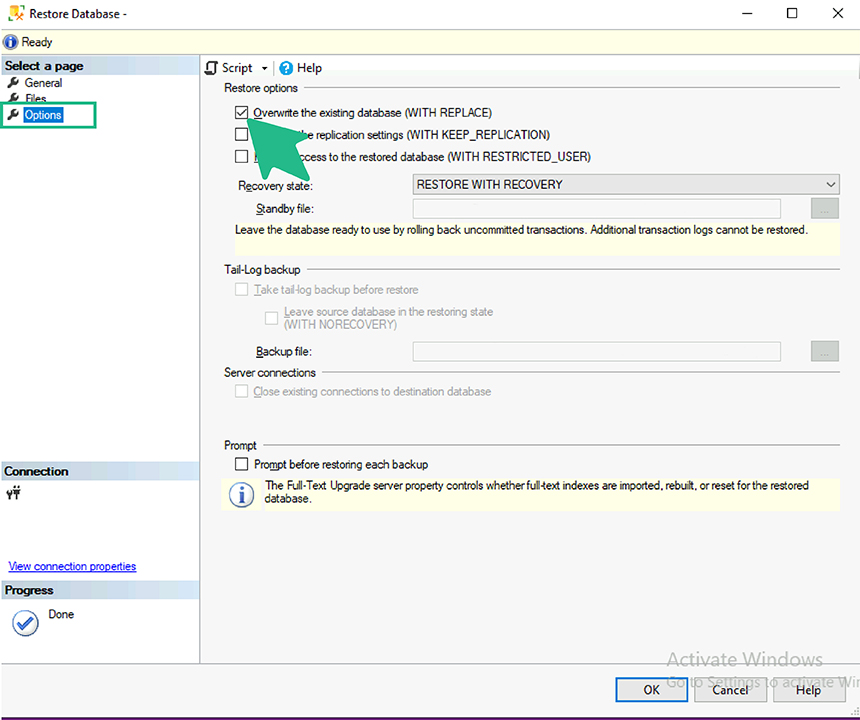 En caso de que la base de datos a restaurar ya exista, ingresá a la sección «Options» y marcá la opción «Overwrite the existing database (WITH REPLACE)».