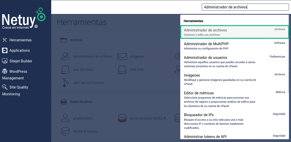 En la barra de búsqueda del tu panel de control (ubicada arriba a la derecha), busca la herramienta Administrador de archivos o File manager (si tenés el panel en Inglés)