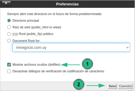 Por último, tildá la casilla que dice “Mostrar archivos ocultos (dotfiles)” y hacé clic en Guardar (o Save).