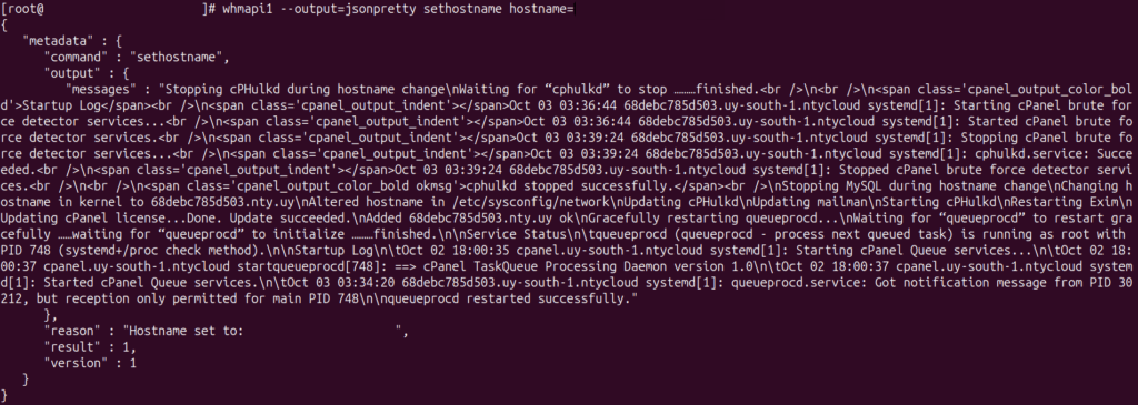 whmapi1 --output=jsonpretty sethostname hostname=miservidor.com