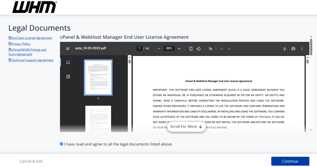 Al tratarse de la primera conexión con WHM, deberás aceptar los términos y condiciones de cPanel.