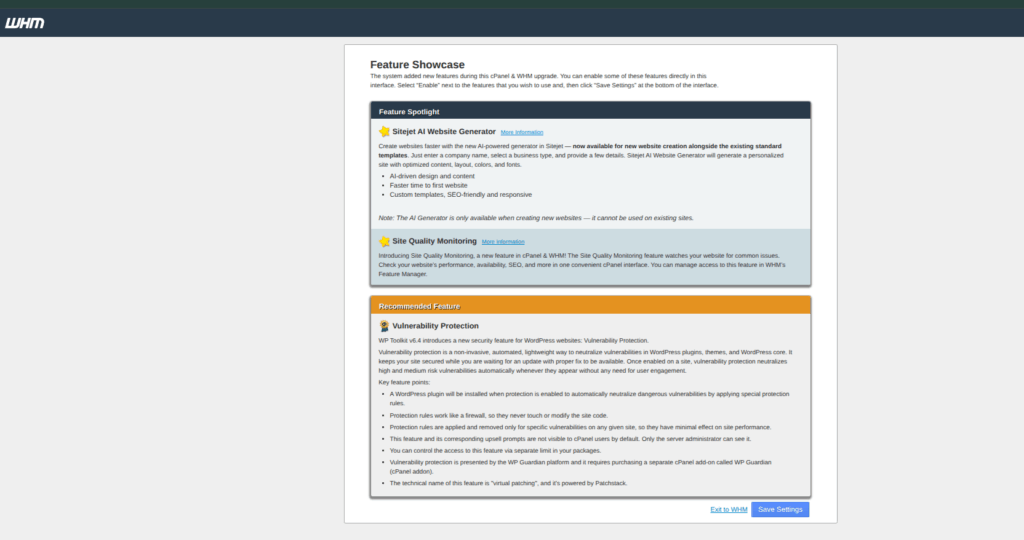 Podés usar el botón «Exit to WHM» si no querés las nuevas implementaciones o «Save settings» si deseás aplicarlas.